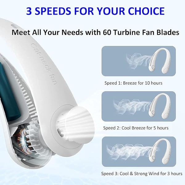 Изработен од материјал ABS и мек силикон, овој вентилатор за врат има флексибилна ротација од 360°,