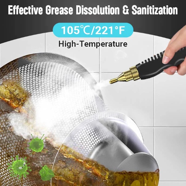 Номиналната моќност од 2500W создава пареа до 105℃ за помалку од 10 секунди, отстранувајќи маснотии, нечистотии, прашина и дамки од различни површини брзо и ефикасно.