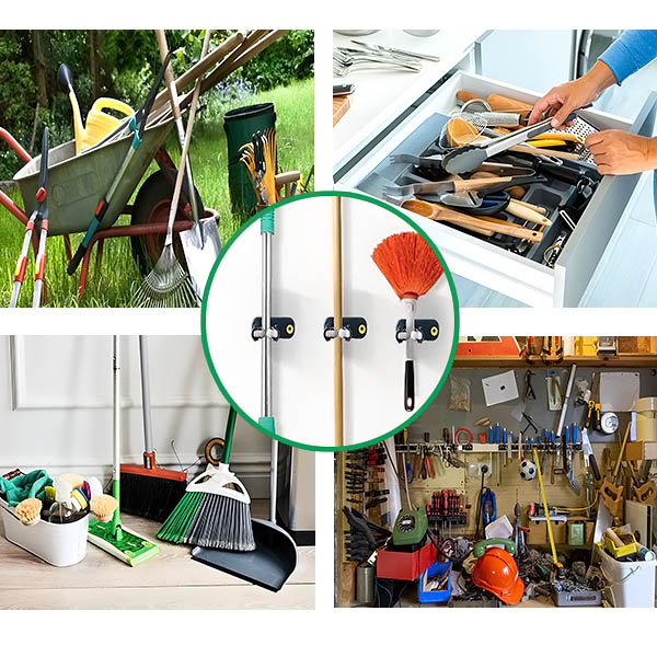 Овие држачи се совршени не само за метли и четки, туку и за алатки за градинарство, чадори или дури и во гаражата за одржување на опремата уредна. Во близина на влезот, во бањата, во кујната или надвор во градината, овие држачи ќе најдат место во секој дел од домот.