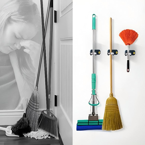🧹 Одржувајте го вашиот простор чист и уреден со нашиот сет од 3 универзални држачи! Идеални за организирање на четки, метли и многу повеќе во домот, гаражата или во градината. 🚪🧺